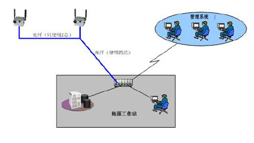 2、每個地面無線網絡基站內放置: 無線AP 外接全向天線 多模光纖收發器 3、地面工作站交換機連接內部管理系統網絡。