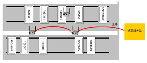 說明: 1、2個地面無線網絡基站安裝在起重機大車跨的左右兩端中間位置,通過光纖連接連接到地面工作站交換機。 下圖為一個無線基站布置示意圖: