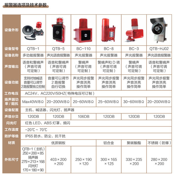 報警器系列產品是LED閃光燈和擴音喇叭同時示警的設備,具有高亮度閃光、響亮音頻報警功能,廣泛用于冶金鋼鐵、港口碼頭、化工、電力、煤礦礦山、工程機械、橋梁隧道等行業設備及場所,我公司致力于智能聲光報警設備的研發與制造,采用先進的聲光控制技術內置語音IC芯片,滿足不同領域的需求,產品具有重量輕、防水、防塵?拐、抗干擾、使用簡單等優點,針對不同生產場所環境和設備開發的系列產品有:多功能起吊報警器、聲光報警器、語音聲光報警器、防爆報警器、電子蜂鳴器等