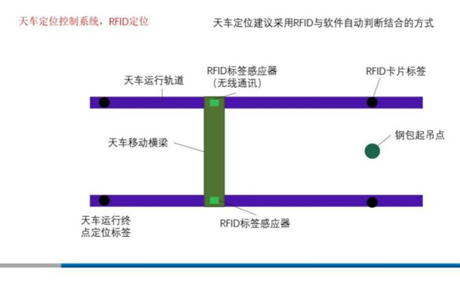 •方案一:采用射頻定位技術(shù),在起重機(jī)跨邊護(hù)欄上對(duì)應(yīng)鋼包工位位置安裝特定耐高溫的RFID電子標(biāo)簽,在起重機(jī)短端梁和電子標(biāo)簽相同高度位置安裝RFID電子標(biāo)簽讀卡設(shè)備,跟蹤起重機(jī)運(yùn)動(dòng)結(jié)構(gòu)運(yùn)行數(shù)據(jù),并在起重機(jī)小車平臺(tái)安裝漫反射激光測距儀,從橫向和縱向兩個(gè)角度對(duì)起重機(jī)進(jìn)行實(shí)時(shí)監(jiān)控跟蹤。