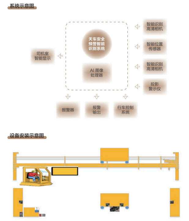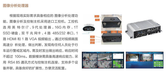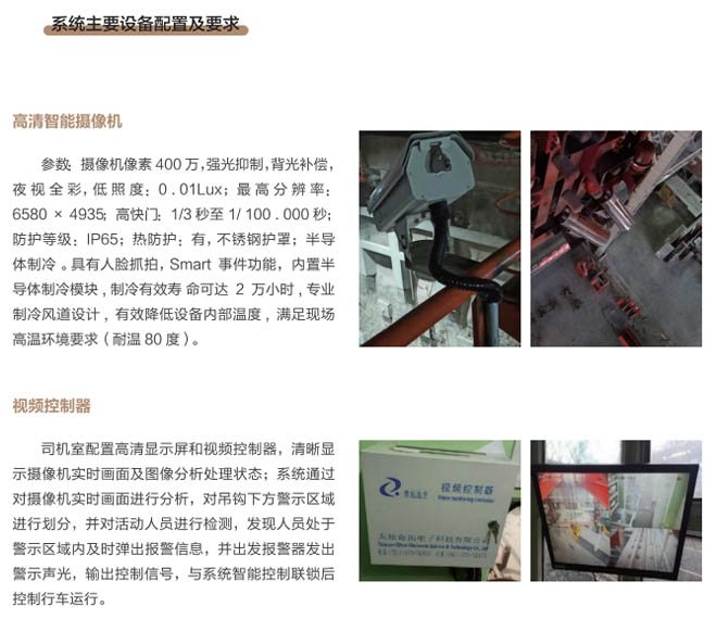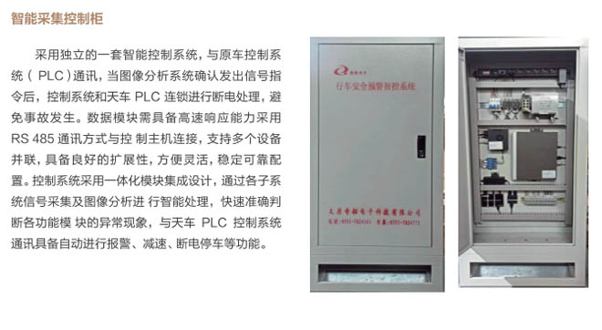 6、行車智控系統:控制系統采用一體化模塊集成設計, 通過各子系統信號采集及圖像分析進 行智能處理,快速準確判斷各功能模 塊的異,F象,與主機PLC控制系統 通訊連接具備自動進行報警、減速、斷電停車等功能,當系統確認發出信號指令后,控制系統和行車PLC連鎖進行斷電處理,避免事故發生。