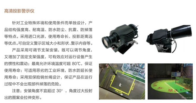 1、區域警示系統:在行車小車底部增加一臺工業警示儀,投影到行車吊鉤下方6米范圍內作為警戒區、4米范圍內作為危險區(警示區域可自行設定區域范圍大小及圖像形狀和文字內容)