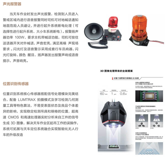 5、位置識別系統:采用定位及位置識別最新技術,通過圖像識別傳感器,識別鋼卷和吊具的位置,進行計算和分析判斷吊具與鋼卷具備吊掛和起吊條件,進行語音提示,系統具有自動識別跟蹤鋼卷與吊具的距離,操作工實時掌握清晰的位置及畫面信息,準確無誤的操作,與天車定位系統拓展能達到自動起吊,最終實現智能化、無人化行車的升級改造。該系統能極大的減少操作人員的誤操作,給生產及安全提供有力保障,提高生產效率及設備安全性。