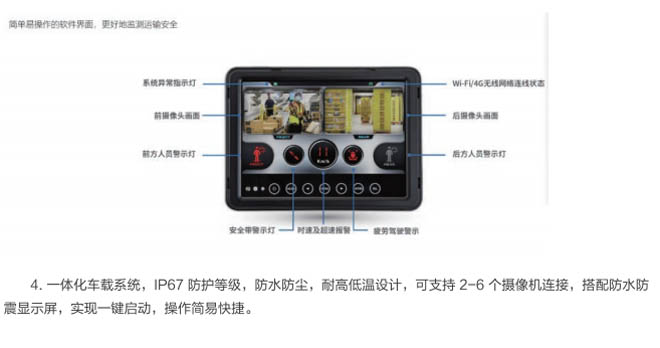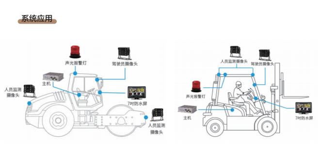 系統配備顯示屏幕,通過視頻圖像可進一步輔助操作人員監測盲區,可任意設定報警區域、危險區域的大小和角度,能對車內外狀態與操作人員進行更全面的實時安全監測并提供聲光報警。電源采寬電壓設計,適用于多種類型特種工程車輛設備的電源使用,并且主機本體、接頭包含周邊配備皆采用 IP67 防護規格,確保系統可以在惡劣環境下正常運行。該系統屬于輔助駕駛系統,為精準駕駛作業保駕護航,是特種車輛設備安全智能管理的首選產品,避免安全事故的發生,極大的提高了生產運營設備安全管理效率。