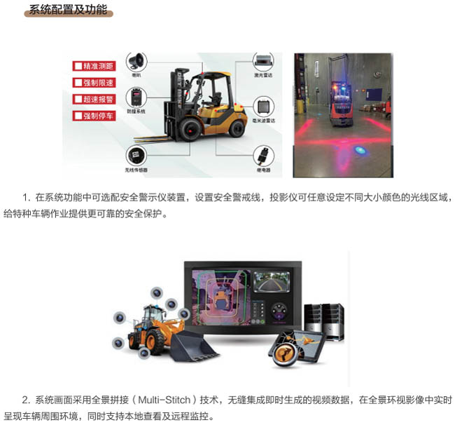 1.基于360°全景環視監控技術,任意設定警戒區域、危險區域大小及形狀,無死角保護車輛設備駕駛作業安全,最大偵測范圍4-5米,防撞距離掃描達20米以上,安裝投影儀可設置警戒線,投影光線在地面形成一個安全范圍
