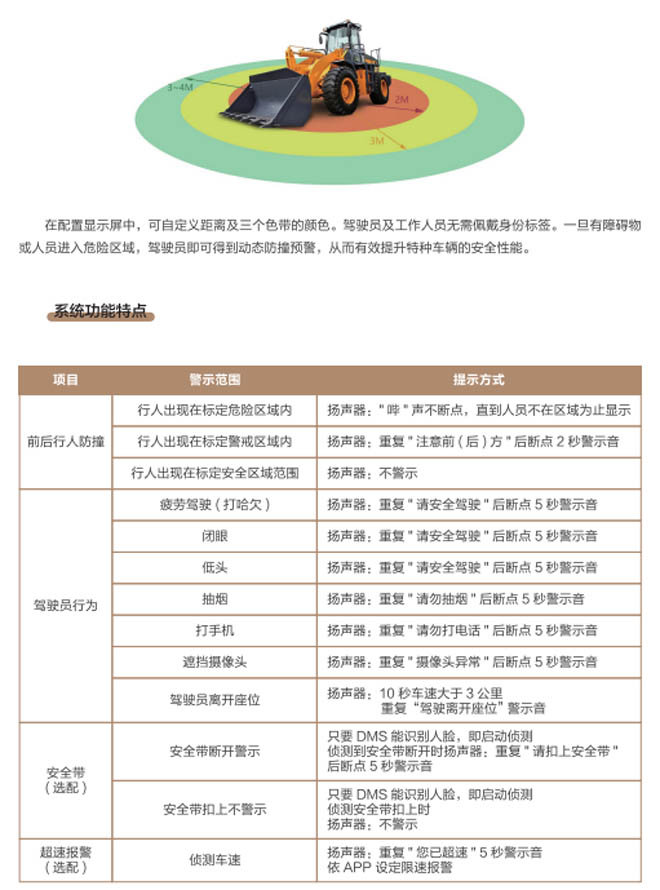 特種車輛智能識別防撞預警系統是專為工程車輛叉車、裝載機、挖掘機、推土機、礦山港口移動車輛設備所設計的智能識別防撞預警安全裝置,能夠實時偵測工作區域的危險狀態并提供警示,有助于提升預防工程特種車輛作業安全。一旦有障礙物或人員進入危險區域,駕駛員可得到動態防撞預警并發出報警進行實時減速或停車,該系統能在各種復雜廠區路況及工礦環境中幫助駕駛員避免危險,預防事故發生減輕壓力,提供豐富的駕駛員輔助環境感知等功能
