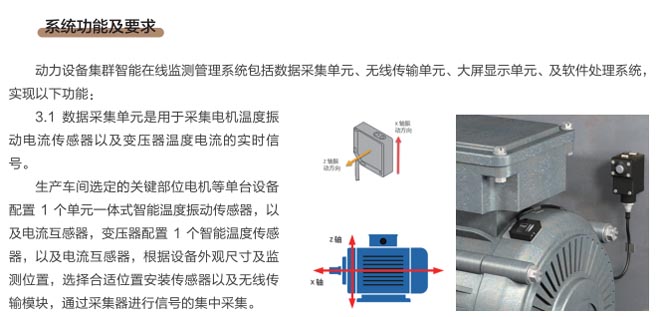動力設備集群智能在線監測系統是通過智能遠程運維系統(RMS)完成工業生產線的電機、減速機、風機、高低壓變電、泵閥等設備運行狀態信息及故障信息檢測,通過檢測設備的溫度、震動、轉速、電流、電壓等數據實時分析處理運行設備狀況,同時通過信息報警推送,智能分析設備運行狀況并實時報警等功能,能迅速找到解決問題的方法。通過在線檢測系統全面實現對關鍵設備的全生命周期管理,提高了設備有效運維時間和效率,降低設備運維成本,降低設備故障時間,減少現場人員維護量,降低維護人員的依賴性。