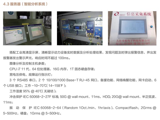 動力設備集群智能在線監測管理系統集成于狀態監測設備上,可通過設備自帶的網絡接口訪問的基于 Web服務的軟件,用于狀態監測任務的配置,實時監測數據的分析和查看。安裝于服務器上器上的設備組態軟件,用于對監測對象進行組態,實時顯示設備群組、單獨設備、單獨測點的監測狀態,進行可視化狀態檢測及設備狀態的在線可視化。